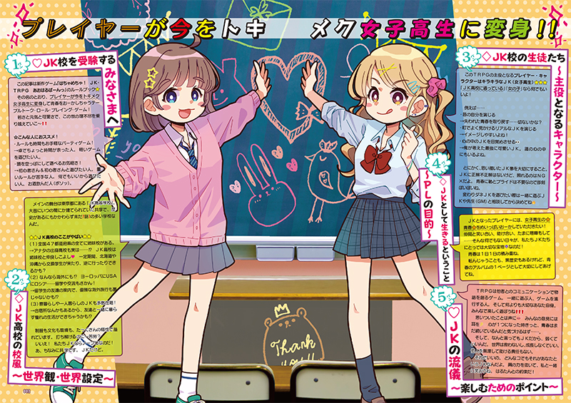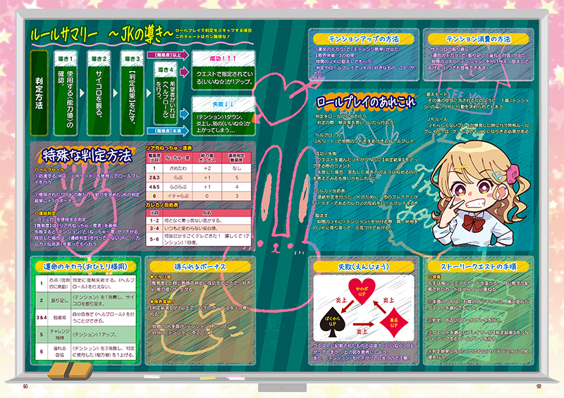 本作のルールブックには、ゲームの舞台となる「JK高校」の世界観・世界設定、キャラクターをつくるためのキャラクターシートなど、ゲームを楽しむためのルールやデータなどがまとめられています。