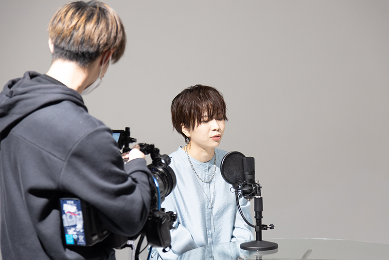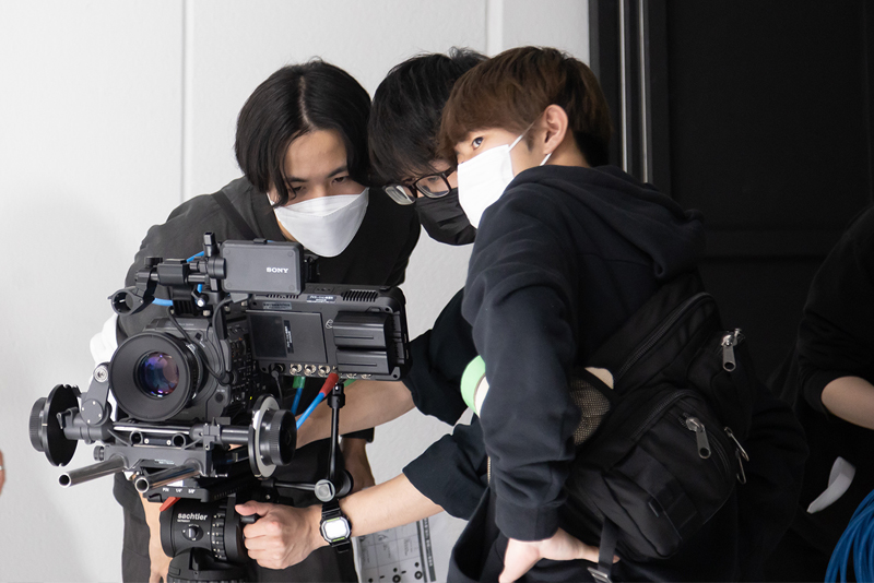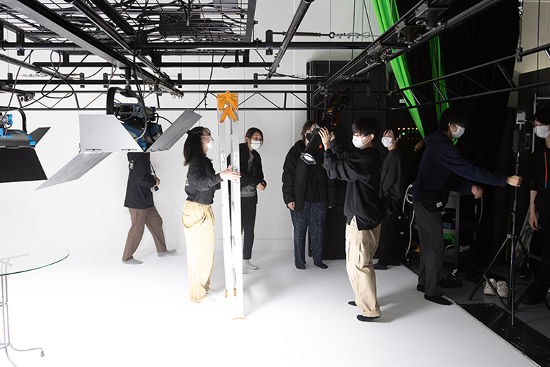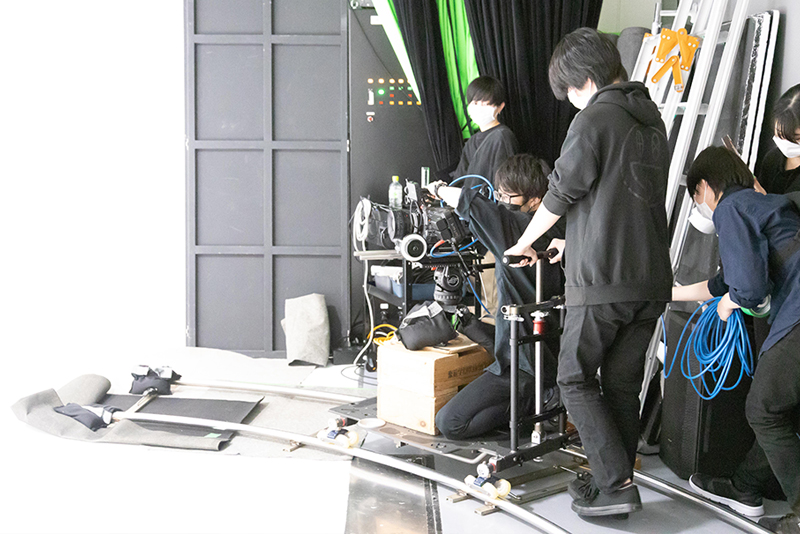 スタジオ撮影当日は、機材のセッティング、撮影・照明・演出まで、一貫してプロモーション映像科の学生たちが行いました。