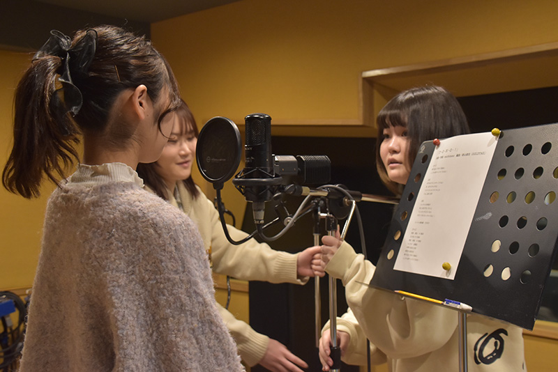 当日は、音響技術科が収録時のエンジニア、音響芸術科が制作回りのサポートのほか告知用動画の撮影、声優科と配信クリエイター科がヴォーカルを担当。学科を超えた協力のもと、michitomoさんが作詞・作曲した「T・O・H・O・!」のレコーディングを進めました。