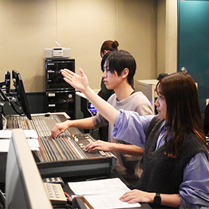 ラジオスタジオでの模擬実習では、ミキサー操作やパーソナリティーへのキュー出しを体験!ラジオディレクターやミキサーなど、ラジオ番組に携わるスタッフの仕事や台本の読み方も解説します。