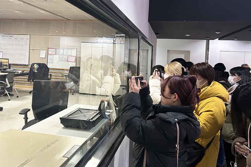 2日目は、人気ドラマ『わかっていても』やバラエティ番組『知ってるお兄さん』を放送しているJTBC(「中央東洋放送」)を見学しました!実際に使われている番組セットや機材、コントロールルームに学生たちは興味津々。話を聞きながらメモを取ったり写真を撮ったりする様子が見られました。