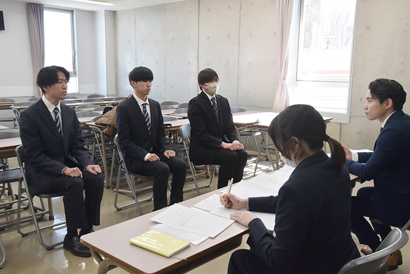2日目は、対面の模擬面接を実施。キャリアサポートセンターの先生たちが面接官となって、本番さながらの緊張感で面接。面接後は、学生一人ひとりに丁寧にアドバイスし、学生たちは自分自身の課題を見つけることができました。