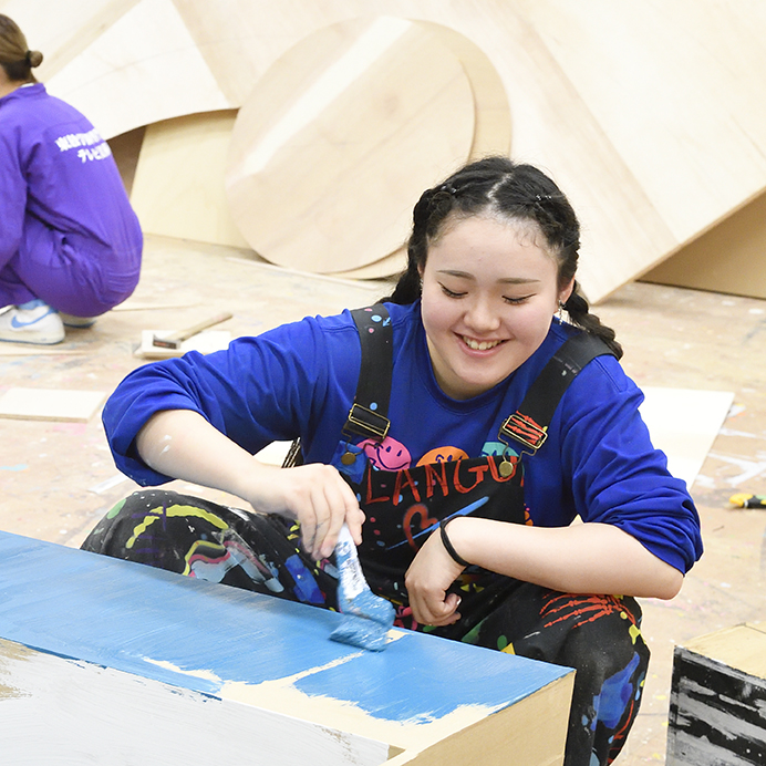 模擬実習では美術の仕事を解説後、大道具の制作や塗装、造形、美術デザイナーなどの体験を日替わりで行います。工具の使い方や釘の打ち方も一から学べます!ものづくりの楽しさを体感しよう!
